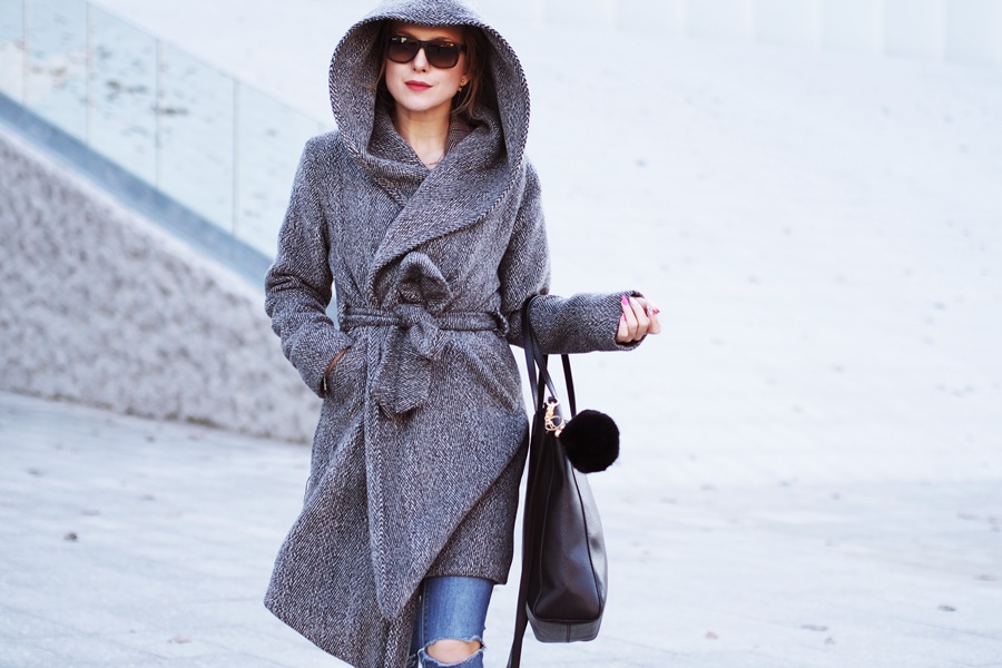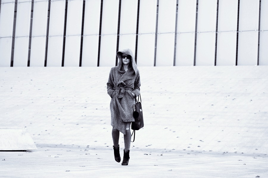 Dziś zaś jestem bezbarwnym cieniem tamtej kolorowej dziewczyny, obleczonym w smutny płaszczok apatycznie powiewający na wietrze. I niech nie zmyli Was mój grymas twarzy na zdjęciach – tak na dwóch z nich moja mina sugeruje, że zamierzam się uśmiechnąć, ale to są dalekosiężne plany! Najbliższy uśmiech planuję na kwiecień. Najwcześniej!