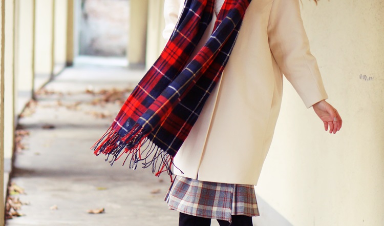 płaszcz – Front Row Shop | spódnica – lumpeks | szalik – Stradivarius | bluza – Preska | kozaki – Deezee