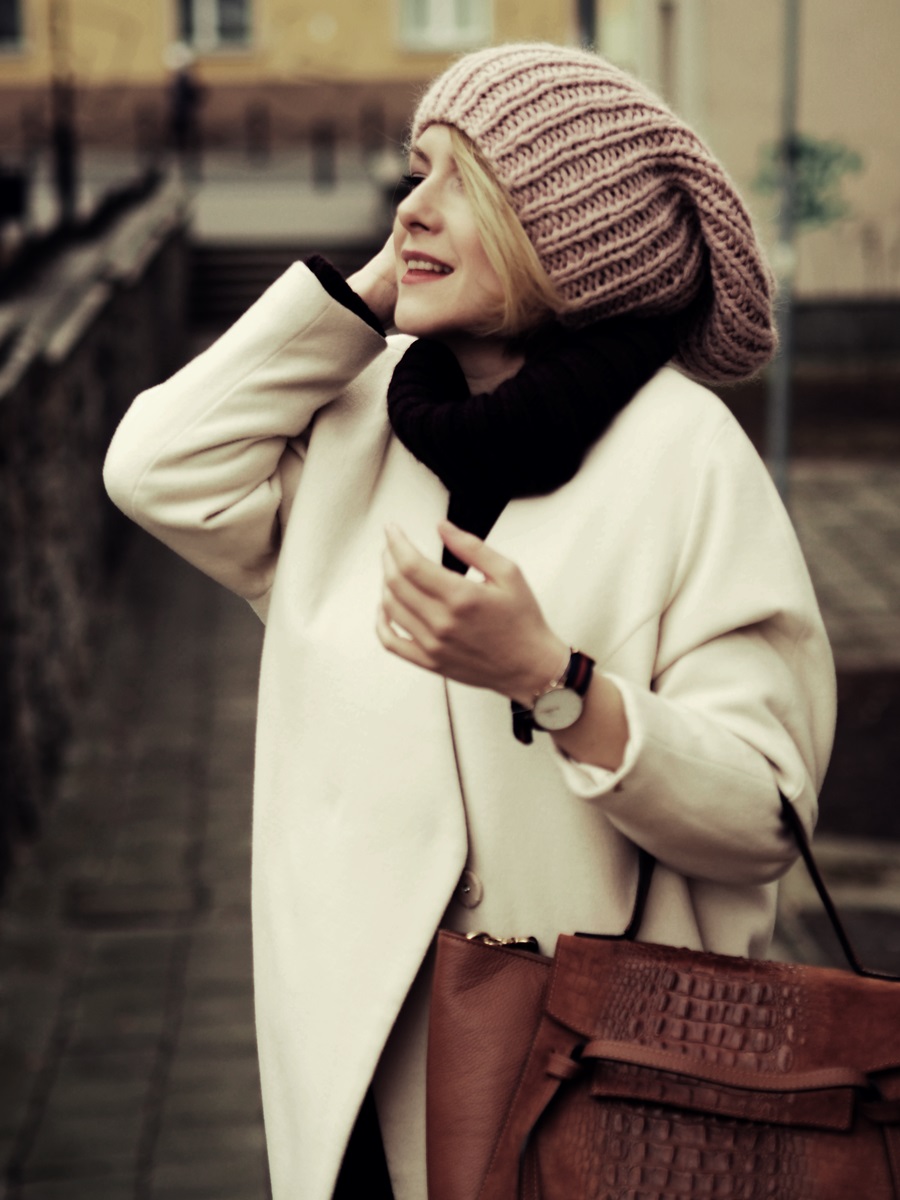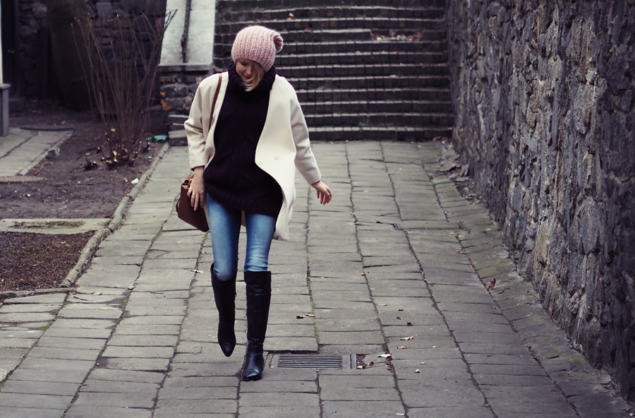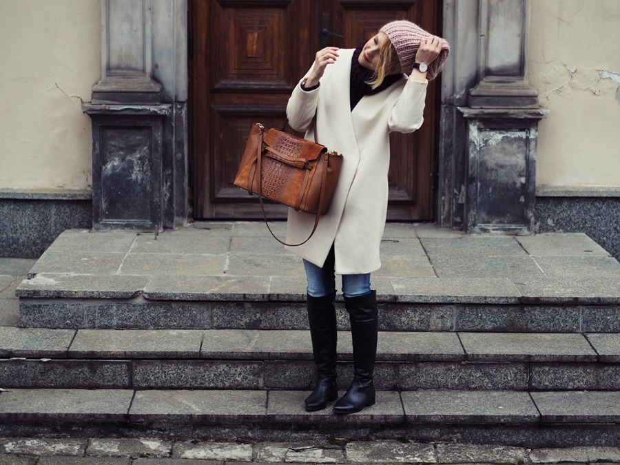 płaszcz i czapka – Front Row Shop | kozaki – Venezia | torba – sklep – sklep-torebki.pl | dżinsy – Unisono | sweter – TKmax | zegarek – Daniel Wellington